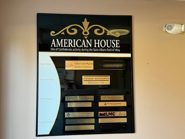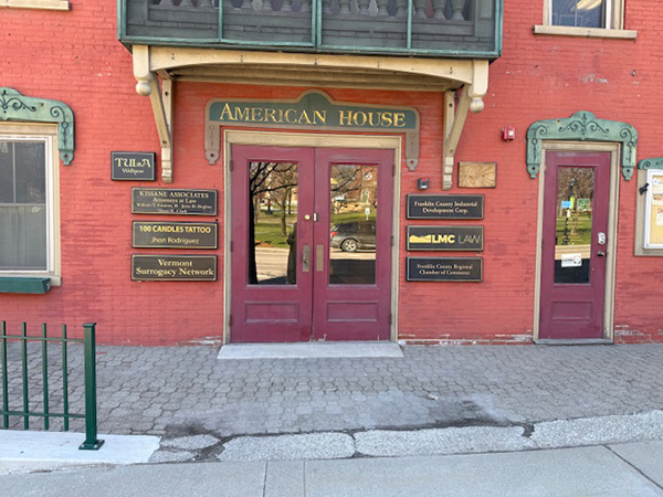 Note: 2 North Main Street, Unit #4, 3rd floor. American House. 2,552 SF +/-. Commercial office condominium. Price $300,000. Municipal Water & Sewer. Natural Gas, Full HVAC. Elevator. Half bath, kitchenette. Corner of Lake & North Main Streets – Join Franklin County Industrial Development Corporation and Kissane Associates in this beautiful historic building, built about 1900 (Elizabeth Peebles – [email protected]).